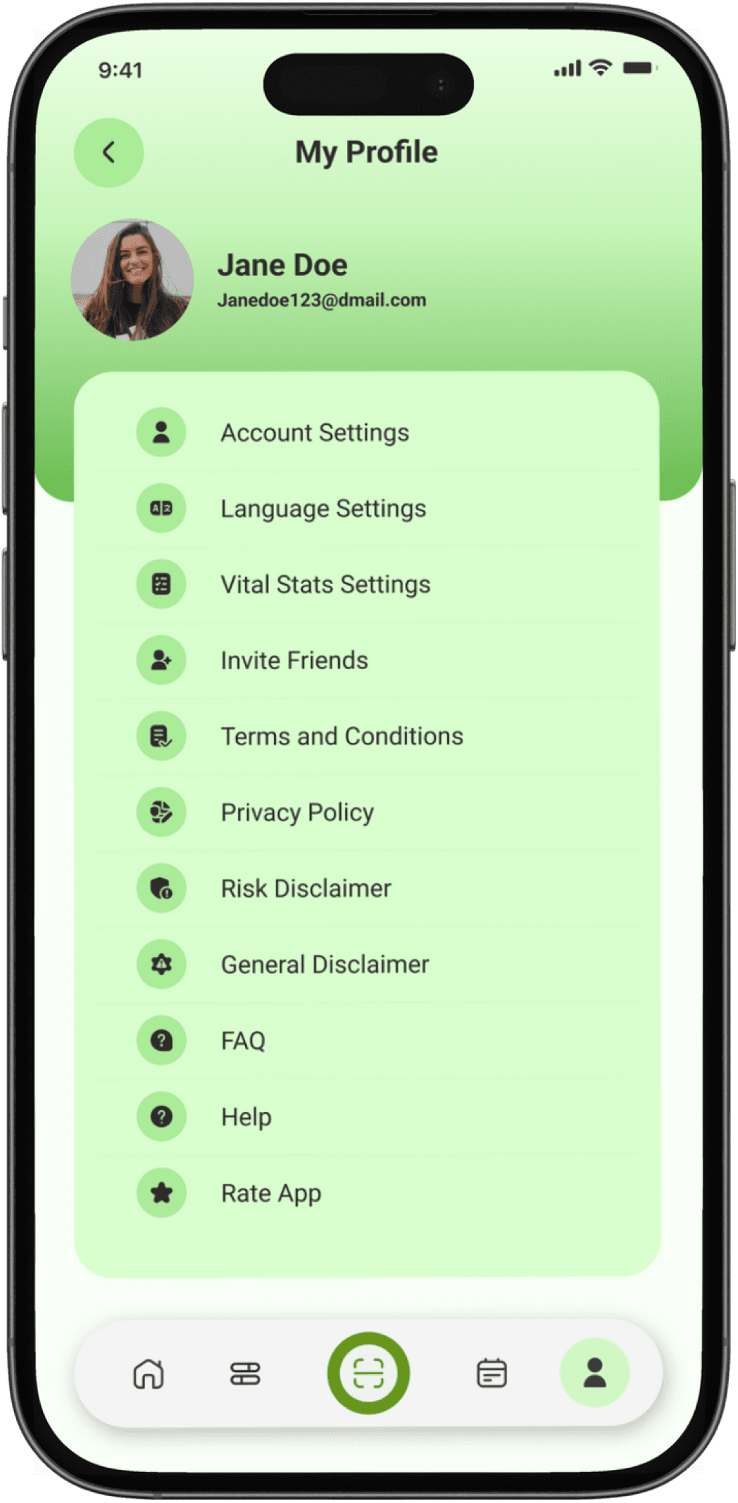 The Profile screen acts as the user’s control center. It displays basic account information and provides quick access to settings such as account preferences, language, and vital stats. Additional options like inviting friends, viewing policies, FAQs, and help ensure transparency, support, and easy account management within a single, organized space.