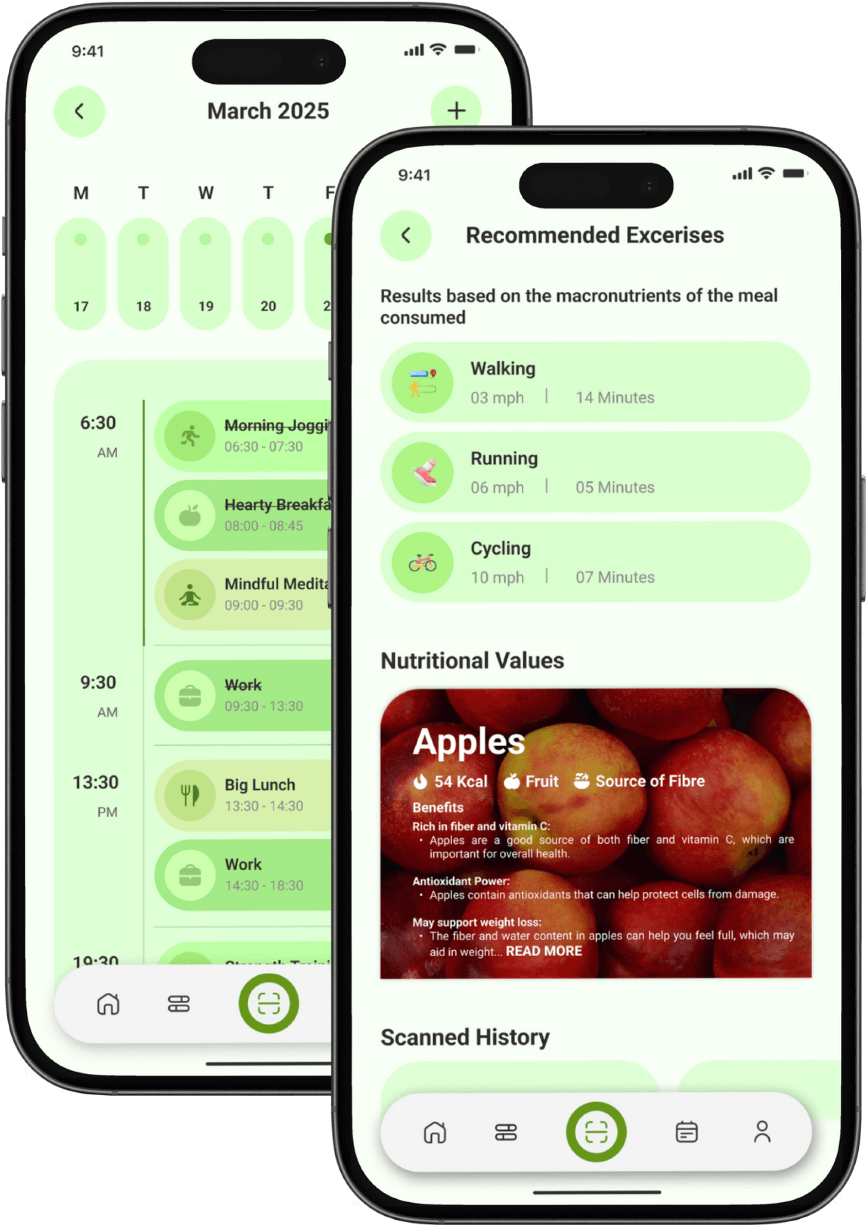 These screens work together to help users plan and act on their wellness goals. The Calendar screen provides a structured daily timeline where users can view and manage meals, workouts, meditation, and work routines, making healthy habits easy to plan and track. Complementing this, the Recommendations screen suggests exercises based on the nutritional value of consumed meals and user goals, while also offering food insights and scan history. Together, they bridge planning and action, helping users make smarter, goal-aligned lifestyle choices every day.
