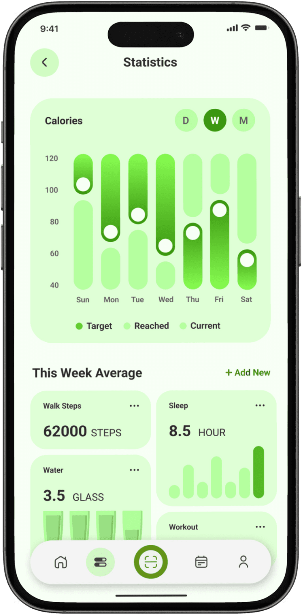 The Statistics screen helps users track progress over time through clear, visual insights. It shows calorie trends across daily, weekly, and monthly views, along with comparisons between targets and actual intake. Supporting metrics like steps, sleep, water intake, and workouts give a holistic view of health habits, motivating users to stay consistent and data-aware.